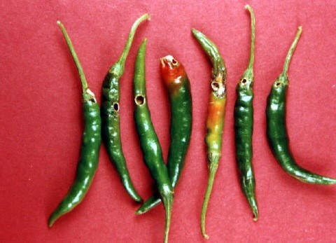 Symptoms: Tobacco caterpillar and tomato fruit borer are also serious pests in chilli and capsicum. These affect the marketable value of the chilli crop to a great extent, if proper care is not taken.